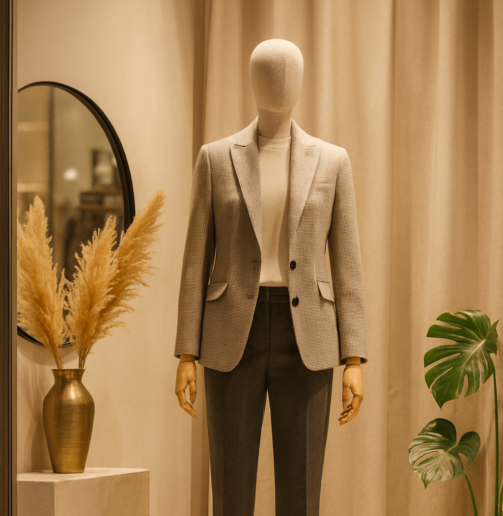 Diese hochwertige Damenbüste in Beige mit beweglichen Holzarmen ist die ideale Lösung für professionelle Warenpräsentationen im Modehandel, in Showrooms oder für Visual-Merchandising-Agenturen. Der Körper besteht aus einer robusten Kunststoffform, die mit einem eleganten Stoff in natürlicher Leinenoptik bezogen ist. Die Holzteile – Arme, Hände und Finger – sind natur lackiert und vollständig beweglich, wodurch flexible und realistische Präsentationen von Oberbekleidung möglich werden.