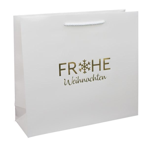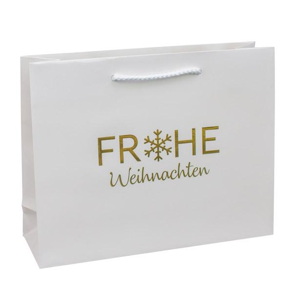 wunderschön bedruckte Papiertasche weiß, mit Heißfolienprägung gold, mit Kordelgriff